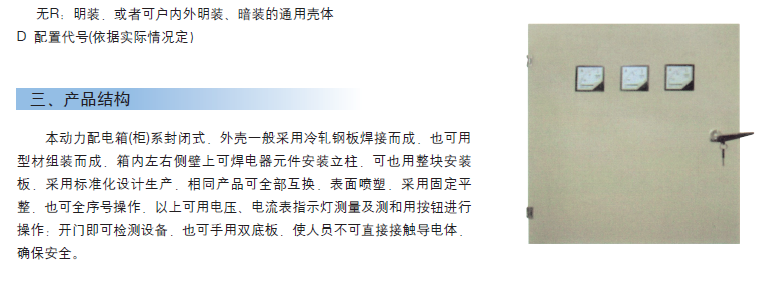 本产品采用了国际IEC标准和国家标准设计制造的新型动力配电箱,此产品选用国外电器元件,或国内生产比较先进的电器元件。